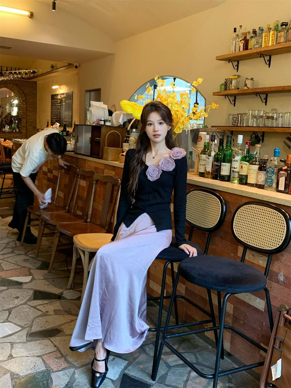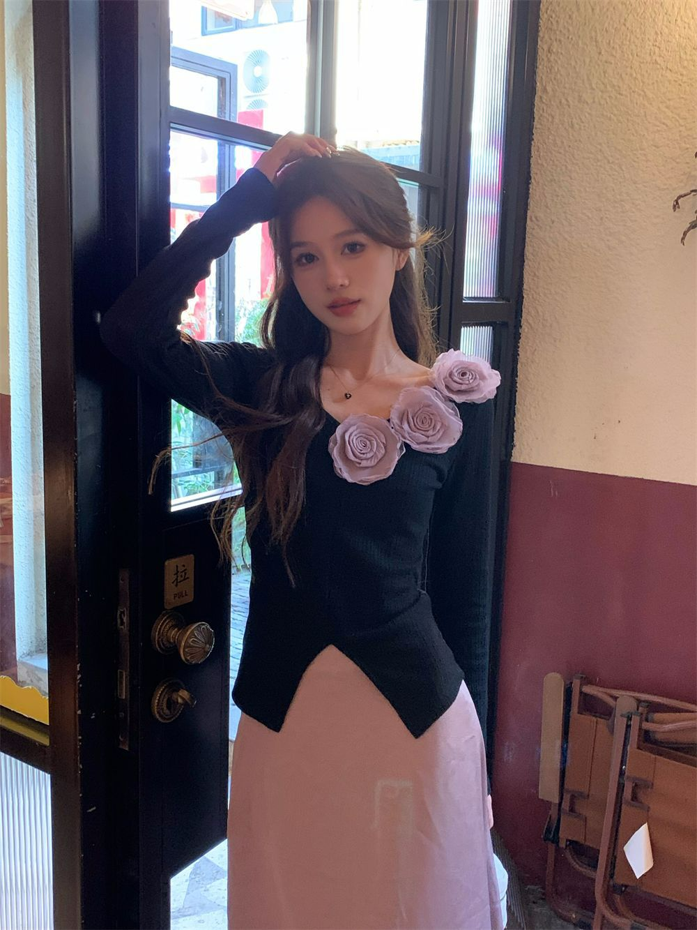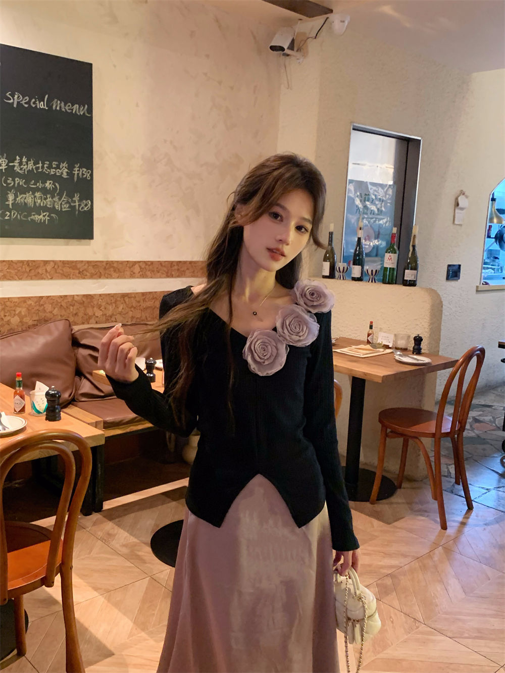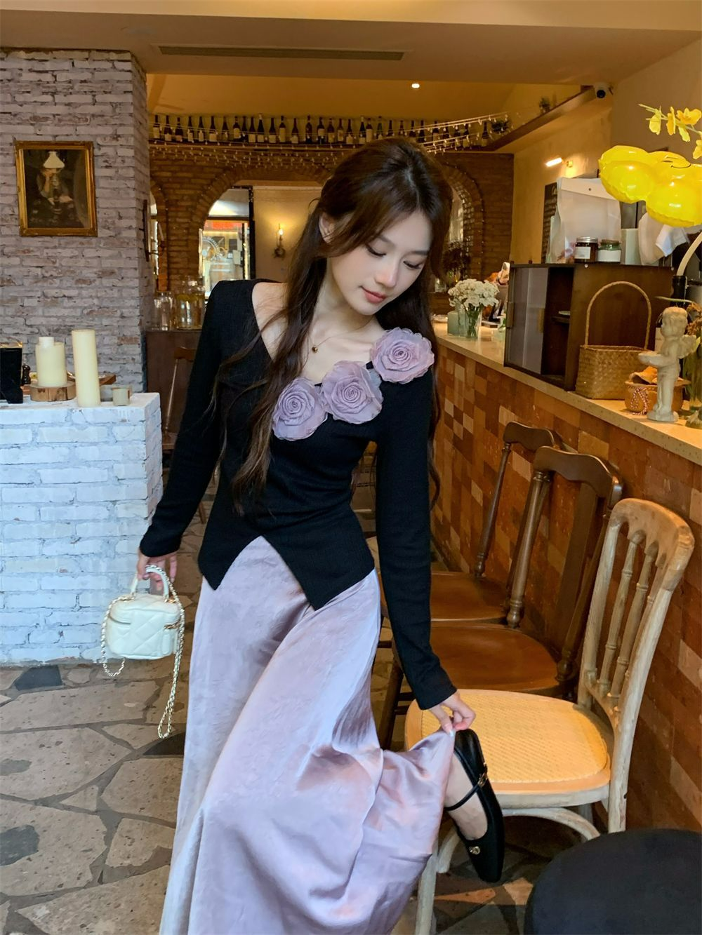 胸元にあるお花で華やかに印象に