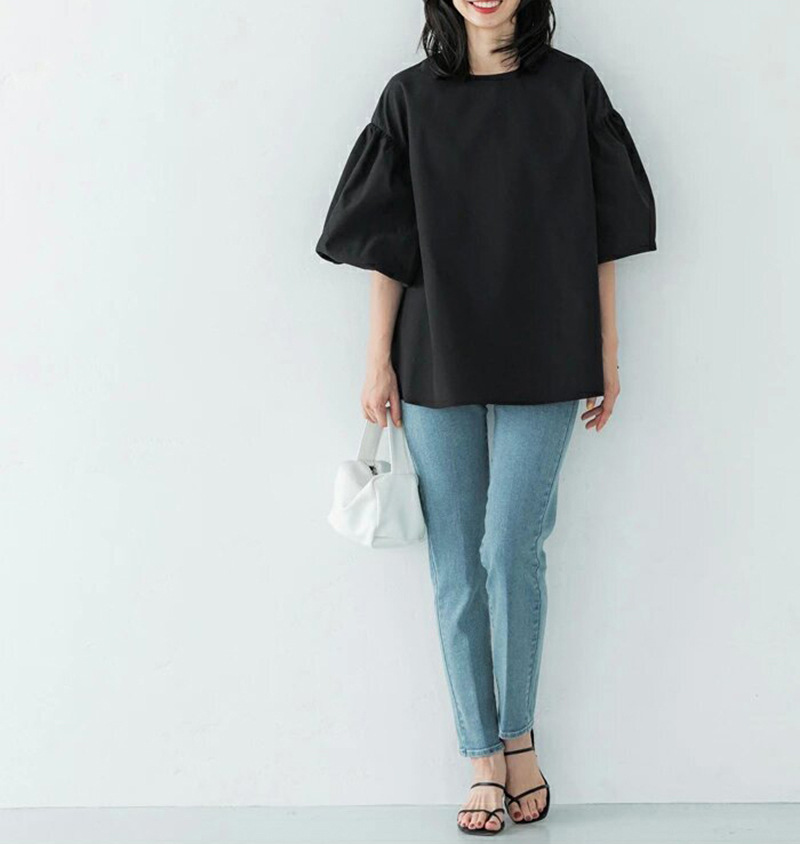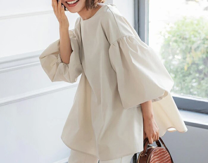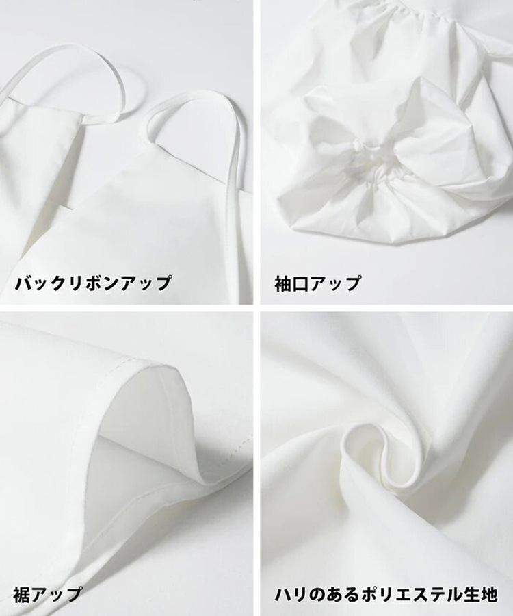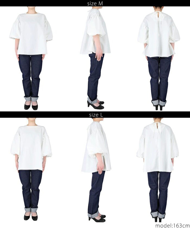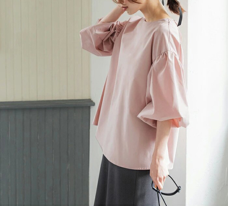 【ポイント】ハリのある生地で立体的な印象に。袖口のパフスリーブがさらに印象付け、バックリボンアップもさりげないポイント