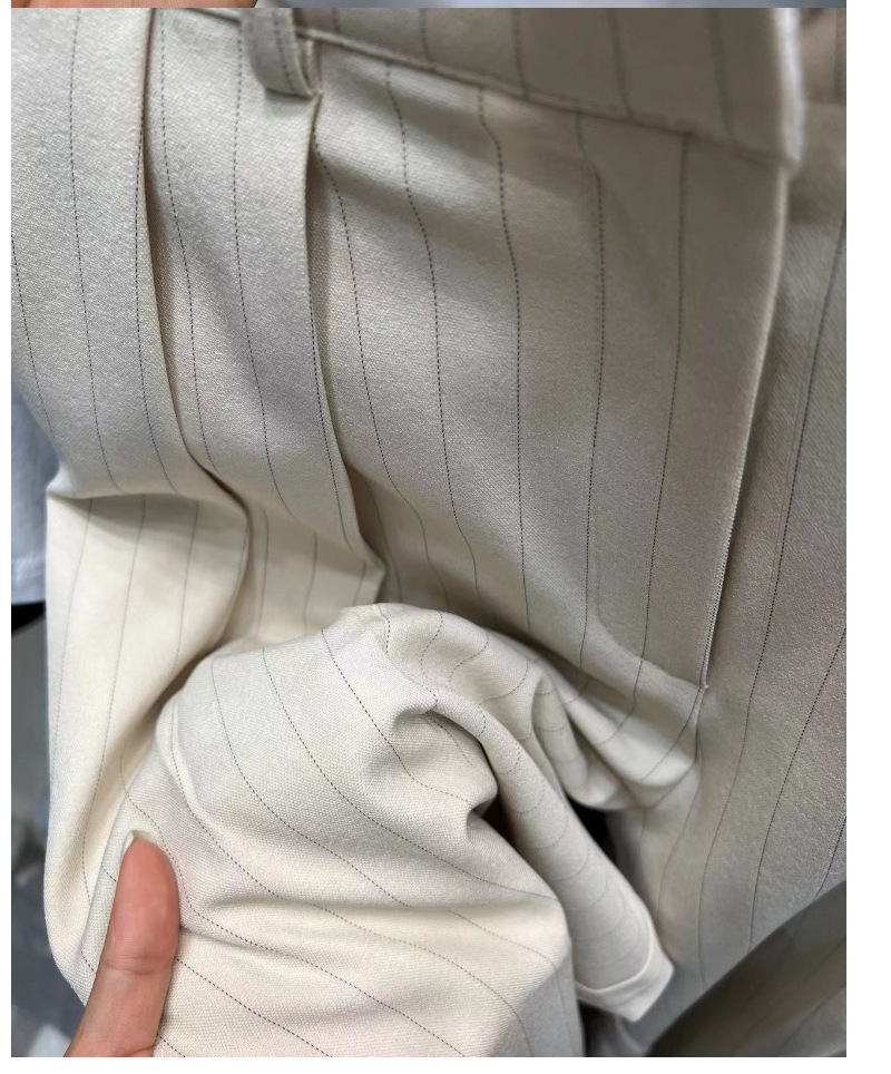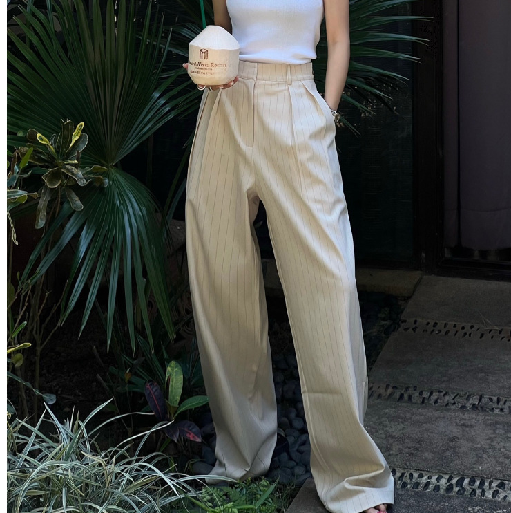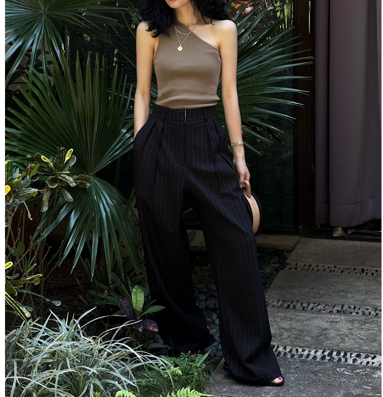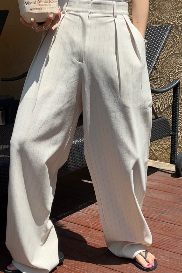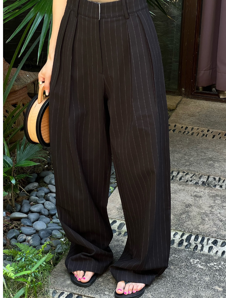 縦ストライプが全体をすっきり見せ、カジュアルすぎず大人っぽい仕上がり。
