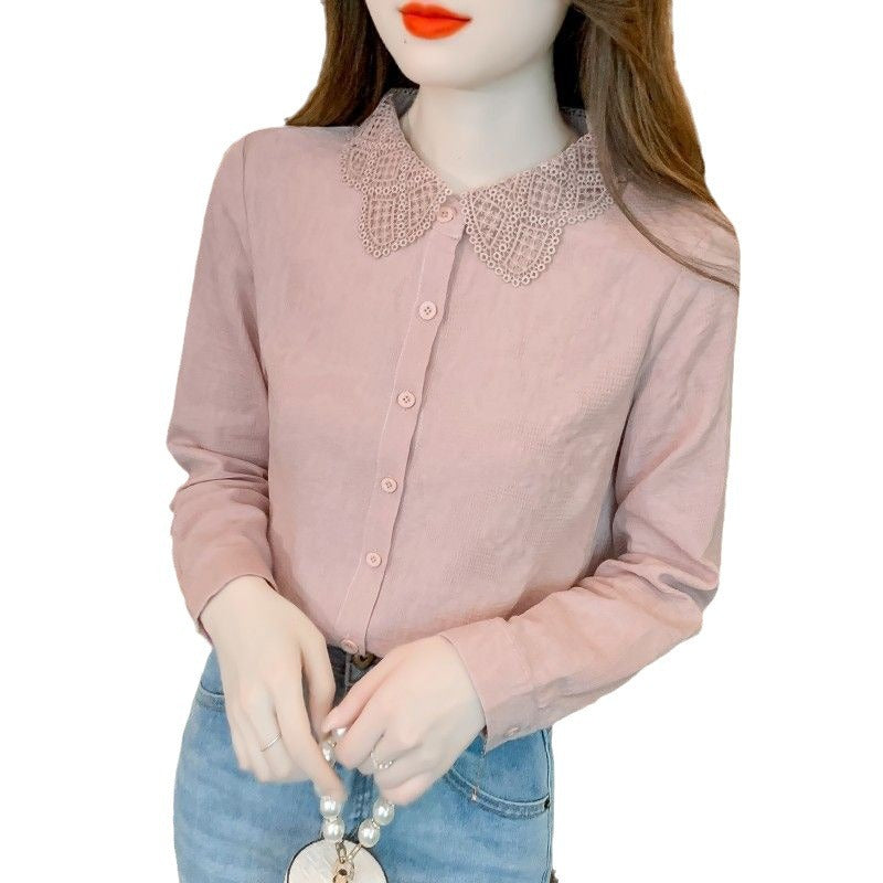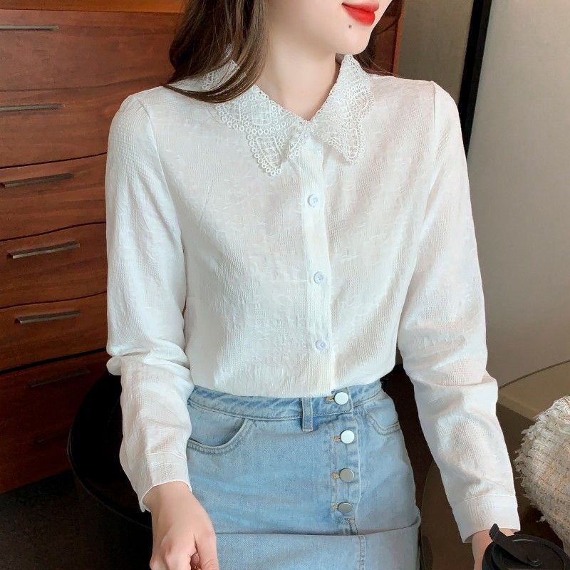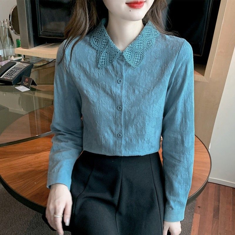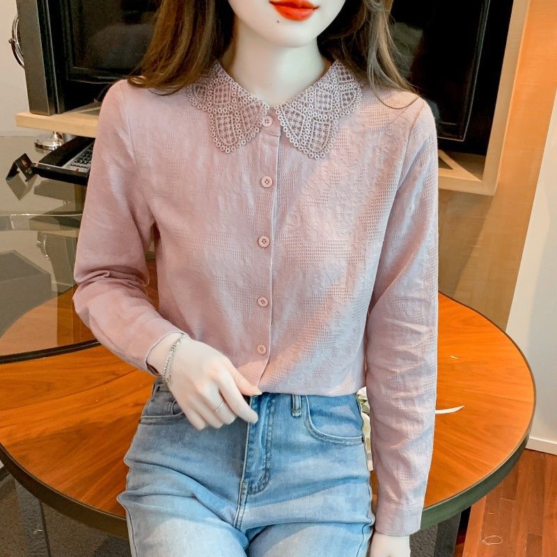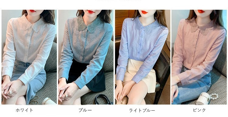 顔まわりを華やかに見せるレース襟が、上品でフェミニンな印象を演出。